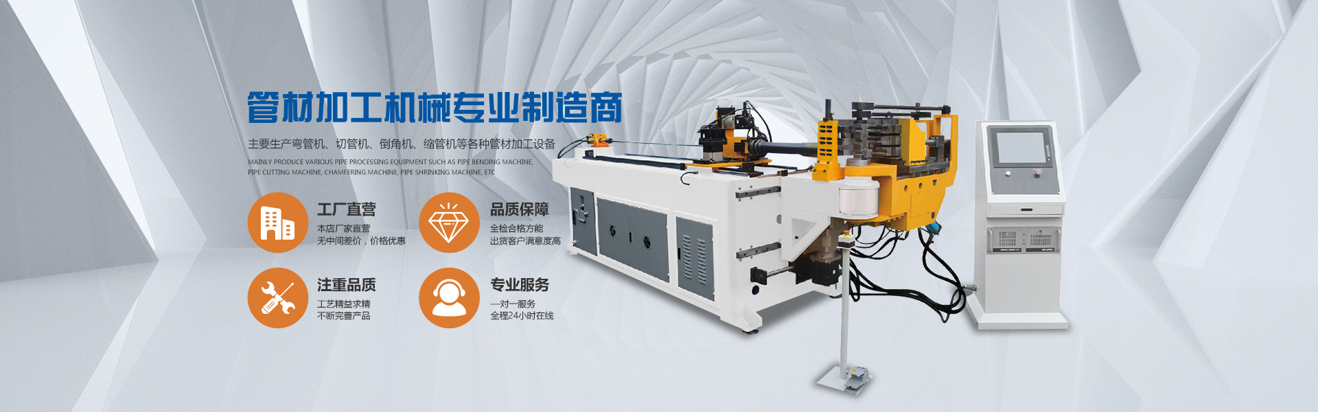 我公司具備雄厚的設計研發能力,先后研制開發了CNC數控彎管機,CNC數控管端成型機,CNC數控金屬圓鋸機,單頭/雙頭倒角機,CNC數控磨齒機等自動化管材加工機械及生產線。為航空航天、重工工程機械、核能核電、風能熱電、造船游艇、汽車零部件、機動車車架、空調制冷、體育健身器材、鋼管家具、旅游休閑用品、水暖衛浴、裝飾用材等行業的金屬管類制品的加工提供了成套,完美的自動化設備。公司可根據客戶需求設計,制造特殊規格的無人智能自動化機型以及各種非標機械設備。